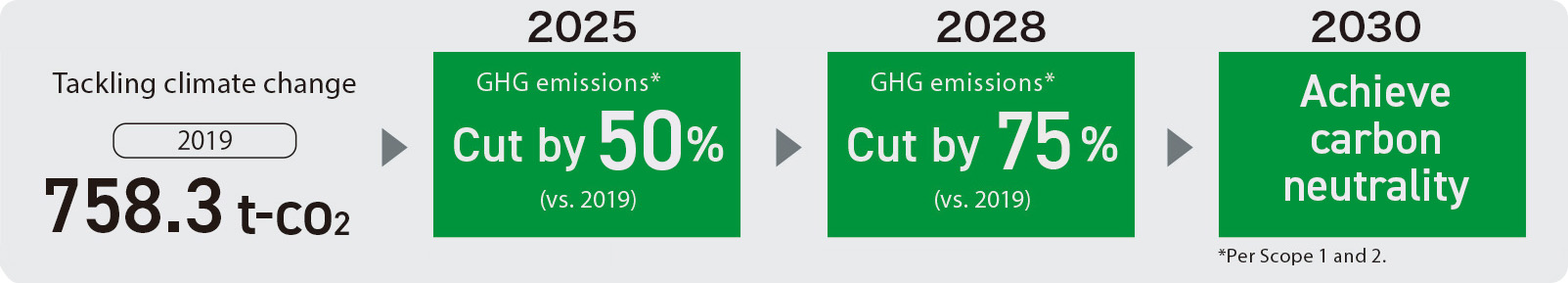 The group’s Mid-Range Business Plan (2023-2025) stipulates a sustainability goal of reducing greenhouse gas emissions by 50% compared with 2019 levels. We have a variety of targets in place, including carbon neutrality and a 100% renewable energy procurement rate at all the group's japanese sites by 2030.