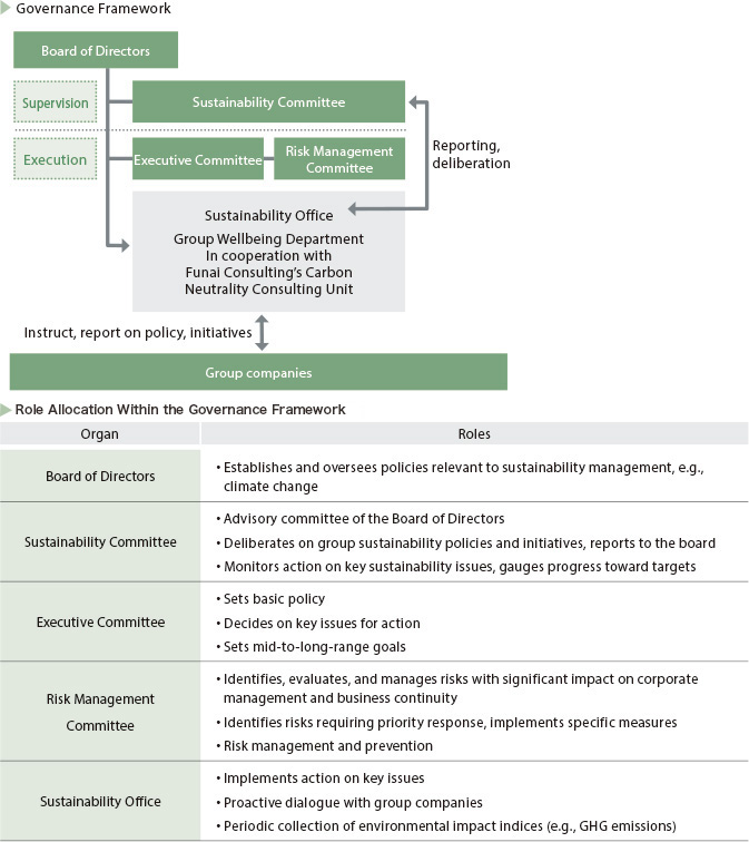 At the Funai Soken Consulting Group, under the leadership of the CEO, the Sustainability Office and the Director in charge work in conjunction with Funai Consulting to assess and manage the financial impact of risks and opportunities relating to climate change, monitor the Group’s basic environmental policy and greenhouse gas reduction targets, implement measures and manage their progress, and disclose information. The Sustainability Office reports those studies and progress information to the Sustainability Committee, an advisory body to the Board of Directors—for further discussion. The outcomes of these discussions are reported to the Board as appropriate for monitoring. Meanwhile, our Sustainability Office has established four groups to oversee action across the whole Funai Soken Consulting Group in four specific areas: the environment (climate change), human capital (our people), information security, and business. The Sustainability Office meets monthly to monitor action progress across the whole Funai Soken Consulting Group and discuss future initiatives.