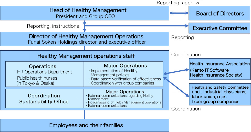 The occupational health and safety management of the group is safeguarded under a system headed by Tatsuro Ono, director and executive vice president at Funai Soken Holdings, and with health and safety managers at each group company coordinated by the Funai Soken Holdings HR Operations Department. In keeping with the Industrial Safety and Health Act, group companies in Japan have health committees in which employees (including union members) and industrial physicians meet to discuss and implement measures to maintain and promote good health and prevent health problems.