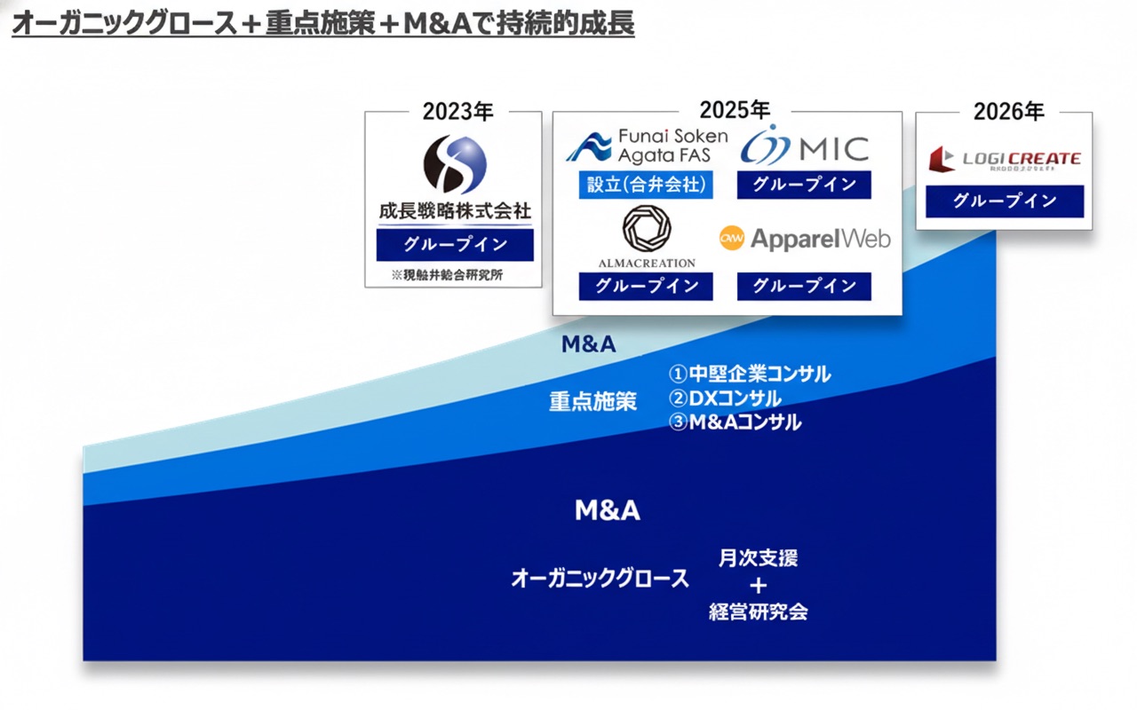 オーガニック成長と重点施策(①中堅企業コンサル ②DXコンサル ③M&Aコンサル)に「戦略的M&A」を掛け合わせ、中長期的な株主価値の最大化にコミットします。