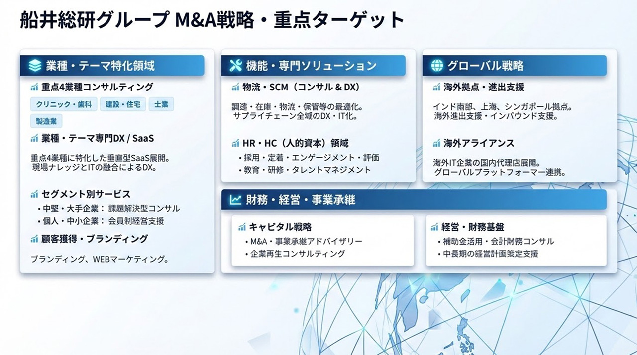 180以上の業種別専門家を擁する「業種特化型コンサルティング会社」としての知見を活かし、ソーシング段階(ノンネーム)であっても、対象企業の事業価値やシナジーの可能性をスピーディーかつ適正に評価いたします。 プライム上場企業としてのガバナンスと誠実な対応で、売主様と貴社の信頼関係構築を強力に後押しすることをお約束します。