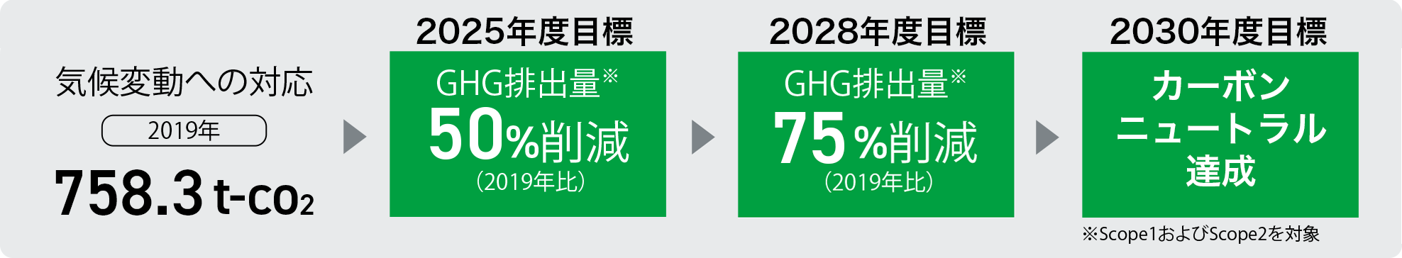 新たに制定した、中期経営計画2026-2028においては、サステナビリティ目標としてGHG排出量(Scope1・2を対象)を2019年度比で75%削減することを掲げています。さらに、2030年にはカーボンニュートラルの実現を目指し、国内事業所における再生可能エネルギー調達率100%を含めた取り組みを推進してまいります。