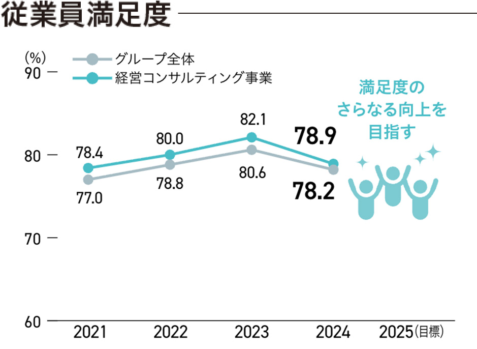 「EVP(Employee Value Proposition:従業員価値提供)の向上」を中期経営計画の人財戦略に掲げ、従業員満足度を継続的に向上させています。